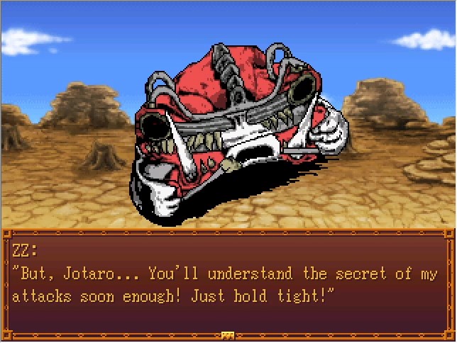 I finally noticed what was weirding me out about this background in particular, ever since that first fight with Polnareff in HK. It's a stock RPG Maker "desert" battle background, while most others are panel rips from the manga.
