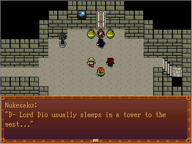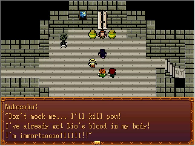 Nukesaku: Waaaah... L-Lord Dio... I haven't betrayed you... I showed them in here because I have so much faith in your strength, my lord! Sure as a stream of piss blowing to the side in a strong breeze... Cascada:Uh... Jotaro:Just forget it... Nukesaku: Please understaaaand! It'd just be a nuisance for someone as powerful as you to have to chase these guys down! I brought them here so you crush them! Joseph: Shut the hell up and just open it!! Nukesaku: Lord Dioooo! Bwuh-huh... Get over here and tear them to pieceeees!!