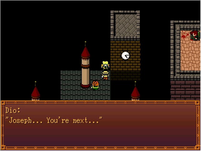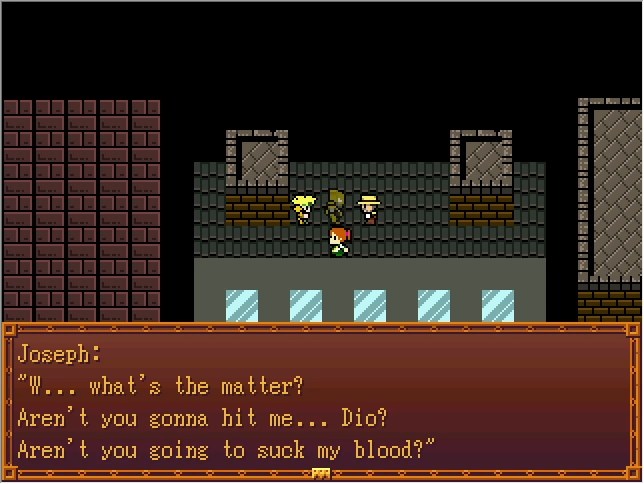 Joseph: !! Dio: It's only fitting that the blood to perfectly assimilate Jonathan's body with mine would be Joestar blood... Don't you think? Joseph: Dio!! Dio: I predict that you'll be sucked dry by me, Dio... As will that girl over there!
