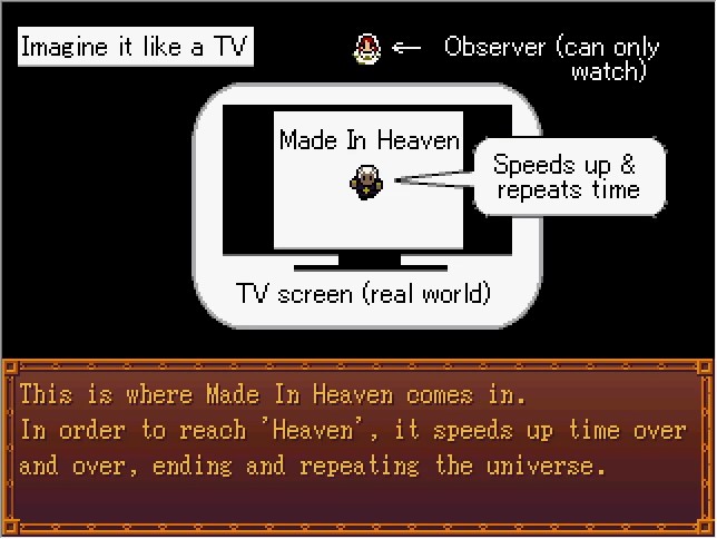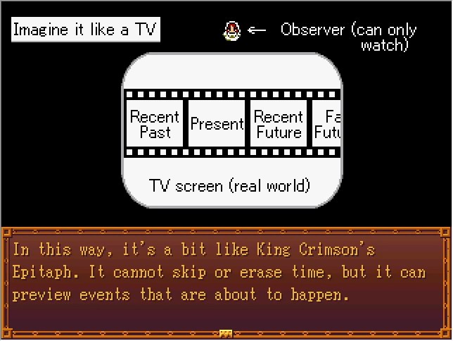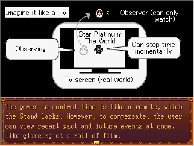 Oh, good! In that case, I can explain in a bit more detail. First, do you remember all of the Stands with power over time? If you use a DVD remote as an example... The World is like a pause button... Bites the Dust is like a rewind button... King Crimson is like a Chapter Skip button...