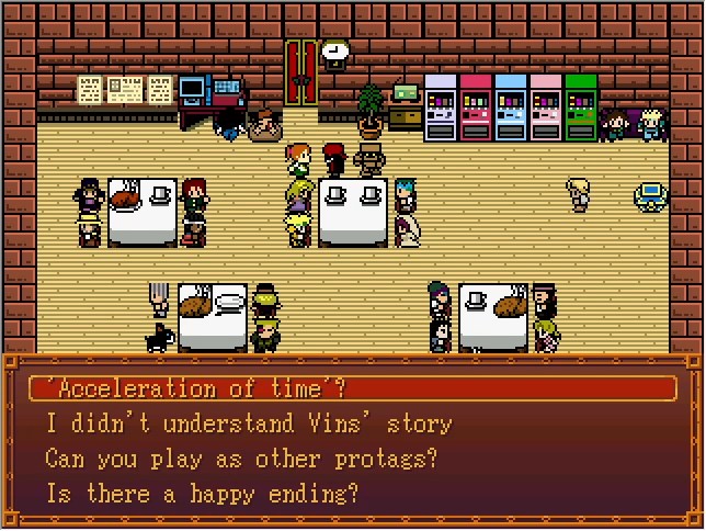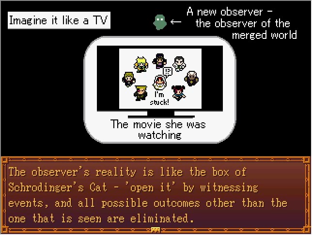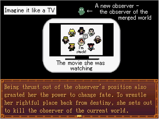 Vins is dropped off in this world, causing the fast-forward to finally stop, but this causes a paradox. This world was created as a result of the image Vins say during the accelerated time, so if she were to begin observing again while time flowed normally, it would cease to exist.