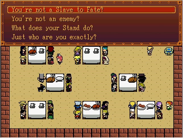 I'm going to truncate this one. Basically you can program in an enemy AI routine for your Stand and the game will generate a code. You can enter the code into the computer and have characters fight little auto-battles against each other.
