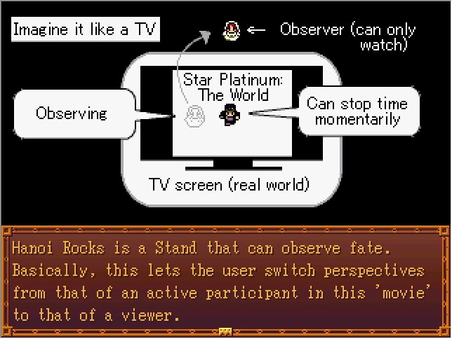 Unlike Thoth, these aren't predictions, but fated events that are scheduled to happen - destiny that is set in stone. Just like Man In The Mirror, which can create a mirror world, Hanoi Rocks allows the user to travel between the real world and the world of the observer... Nothing more, nothing less. Vins' problem is that Hanoi Rocks' power causes everything she watches to become true reality - nothing can be done to change the result once it's been observed.