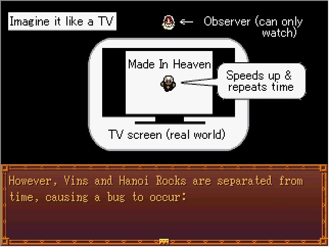 ...And Made In Heaven is equivalent to Fast-Forward. However, Made In Heaven has another function... Auto-Repeat, or looping. Continuing the DVD player analogy, let's imagine the world like a movie on a TV screen to simplify things. Next, I'll explain Hanoi Rocks...