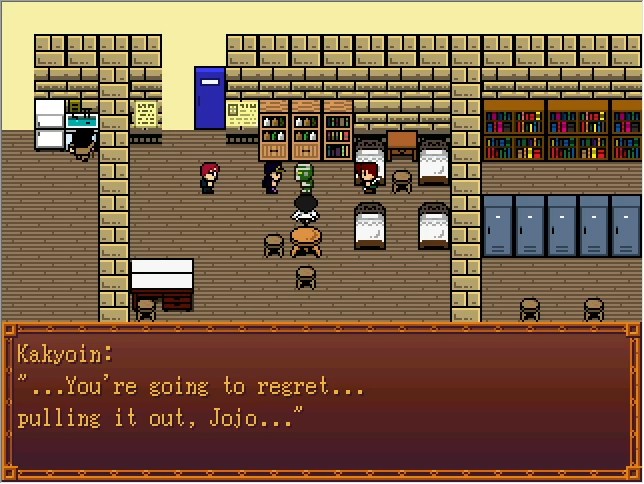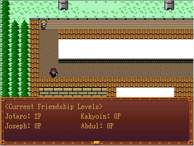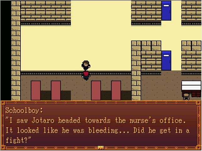 Despite only ever being referred to as "Schoolgirl" in-game, the event files refer to this character as "Fumitake Katsumi" and describe her as "a rough girl with a foul mouth but a gentle heart". She's meant to be the 7th Stand User's friend from junior high, a cheerleader, and a secret Jotaro fangirl.