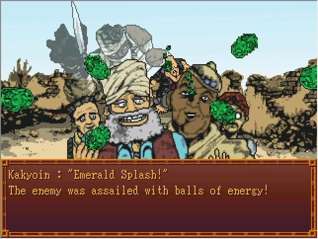 Joseph: We heard about Funky Party. ...We had to bury him in a shallow grave. Kakyoin:May his funky party in the sky never end... Hol Horse: Oh, come on! I didn't mean to kill him! It's J. Geil you want! Honest! Kakyoin: The coward who stabbed Bradio in the back was J. Geil, but this guy's bullet delivered the killing blow. He'd have survived if he hadn't been stabbed, but... What should we do with this guy? Polnareff: I'll lay down the sentence... Death!