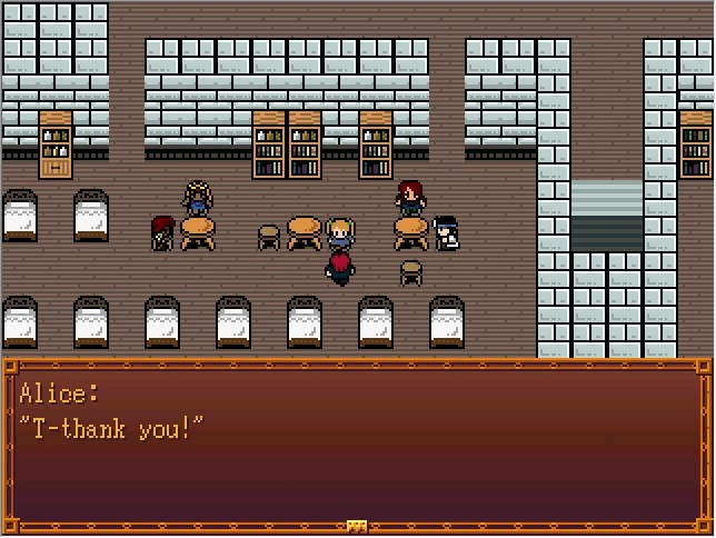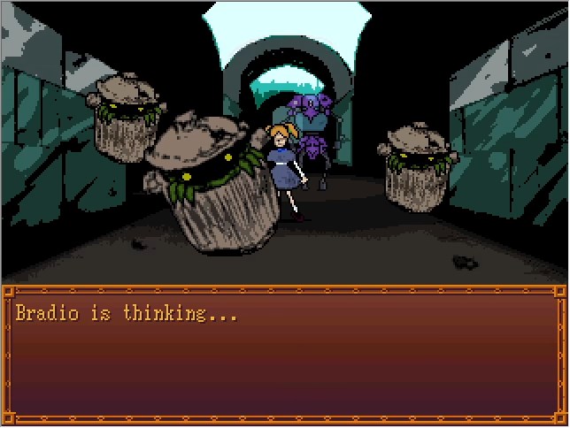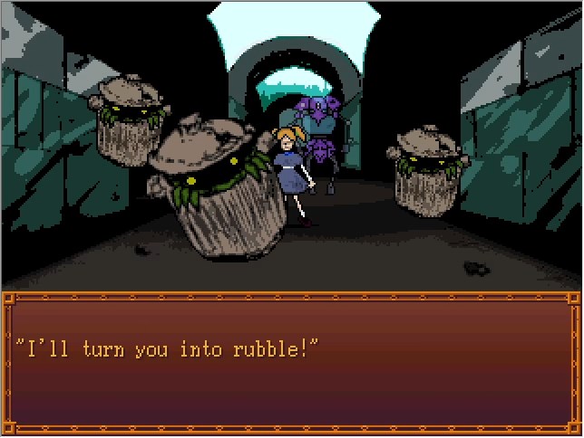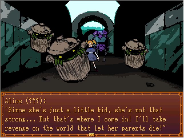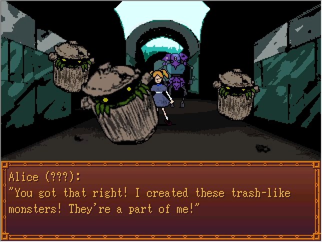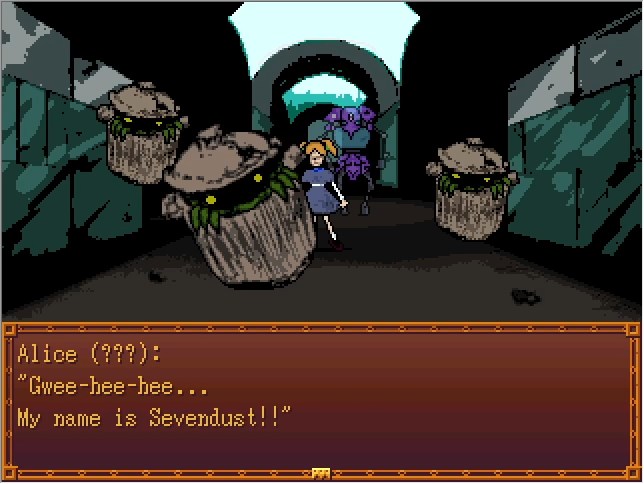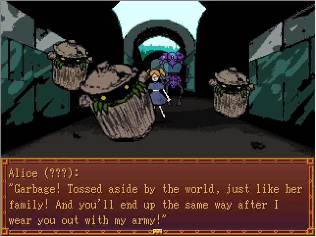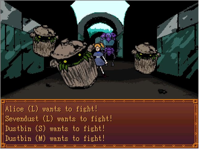 Alice has a scant 50 HP and will explode into gibs if we do pretty much anything. This is not helped by most of Deep Purple's attacks being multi-target. I do appreciate the foresight in having our AI-controlled party members Hold Back here, which forces them to automatically guard every turn. Otherwise the nukes might come out to play and that'd just be a bad time for everyone involved.
