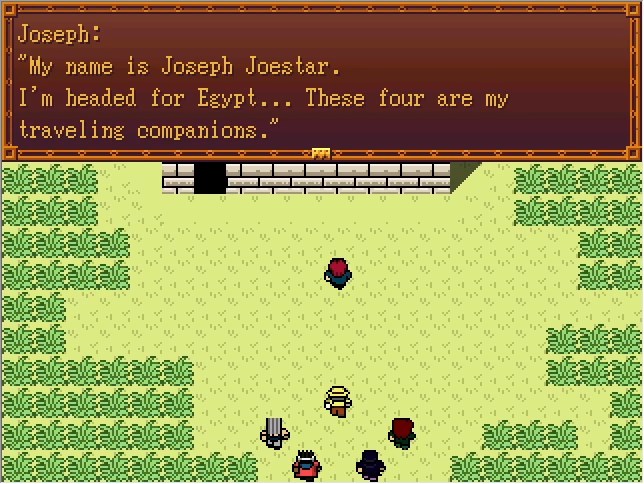 Jotaro: Yo, Bradio. Kakyoin: How've you been? Abdul: Is your back feeling any better? Bradio: It's getting there. There's just a little scarring. Joseph: How was your trip back from India?
