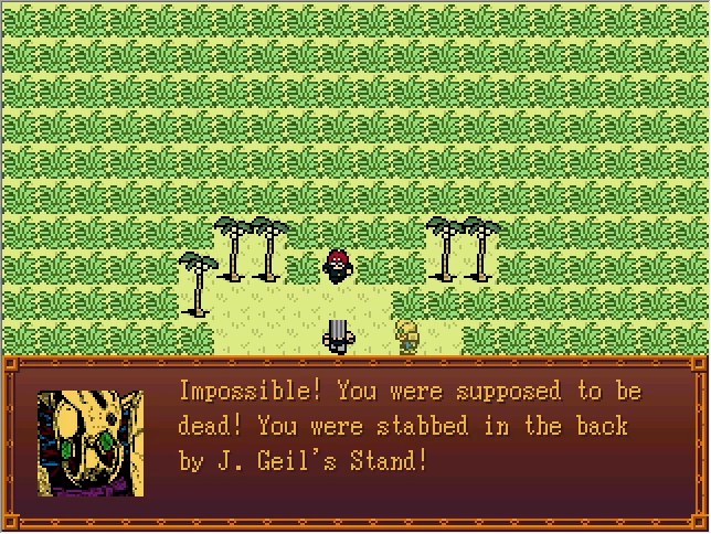Cameo: Nnnnngghhh... Bradio: You said you were the Stand of the Judgement card, right? I've decided to finish you off... and send you to hell! HELL 2 U! Polnareff: My... My 3rd wish... It really did come true...!! Bradio: Bradio still lives! Shouldn't you be running off to let your buddies know the bad news? Eh, Cameo? Polnareff: (That's right! I have to tell everyone!) Cameo: ...That is some terrible news... But by the time I tell them, it'll already be irrelevant... Instead, I'll tell them about how Cameo beat the snot out of that asshole Polnareff and the still-living Bradio! Oh, what splendid news!