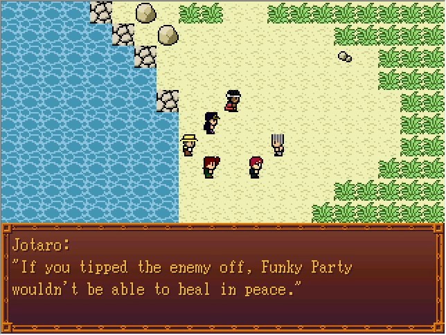 Kakyoin:I knew it... Bradio wears glasses... Polnareff:You're right... it's completely impossible for this to be him... Joseph: But... explaining the circumstances of Funky Party's death... won't be easy. Polnareff: ......... Joseph: You had no part in his death, Polnareff. Polnareff: ...No... I'm partially responsible. I've already accepted that fact. Kakyoin: Is he a Stand user as well? Joseph: Yes... He's been targeted by Dio's assassins as well. Which is why he saw right through my story... Kakyoin: Is he planning on coming with us? Joseph: Yes, he said as much, but I don't like the idea of endangering yet another innocent life...