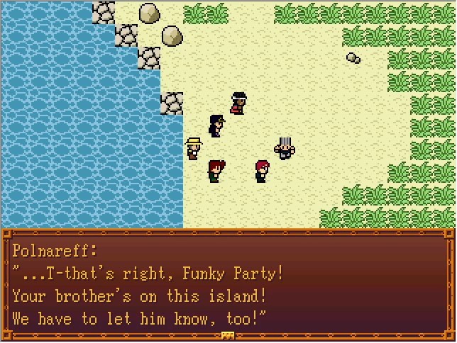 Jotaro: So this is how we're crossing the Red Sea? Kakyoin: We should be able to evade the enemy's sight this way... Polnareff: Man, this is turning out to be an expensive trip! Funky Party, do you know how to operate this thing!? Bradio: No, I had Stroheim drop it off. Joseph: Don't forget about me! Bradio: I'd rather Abdul take the wheel. Jotaro: You've lost your privileges after what happened last time, Gramps.