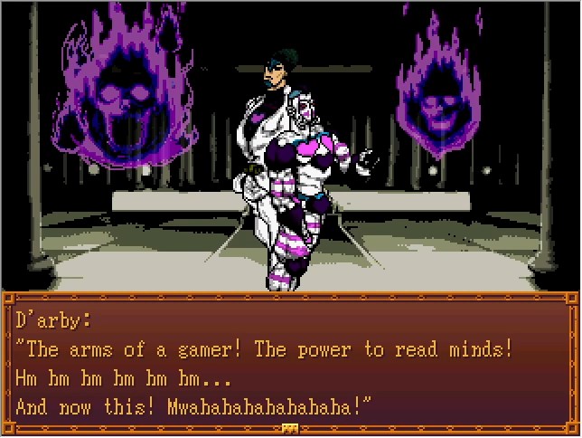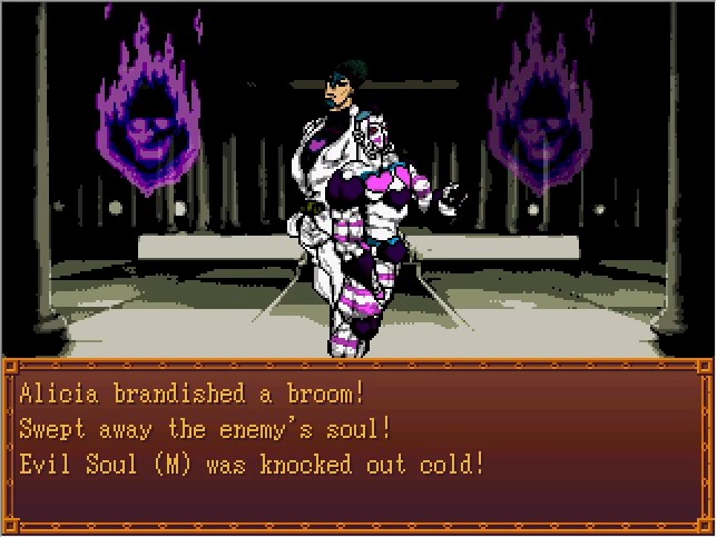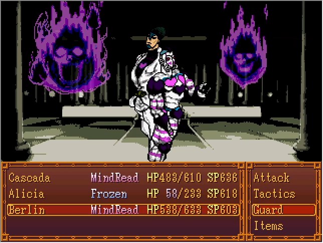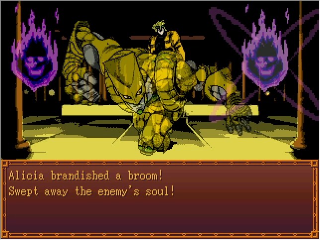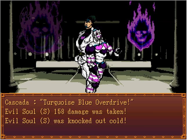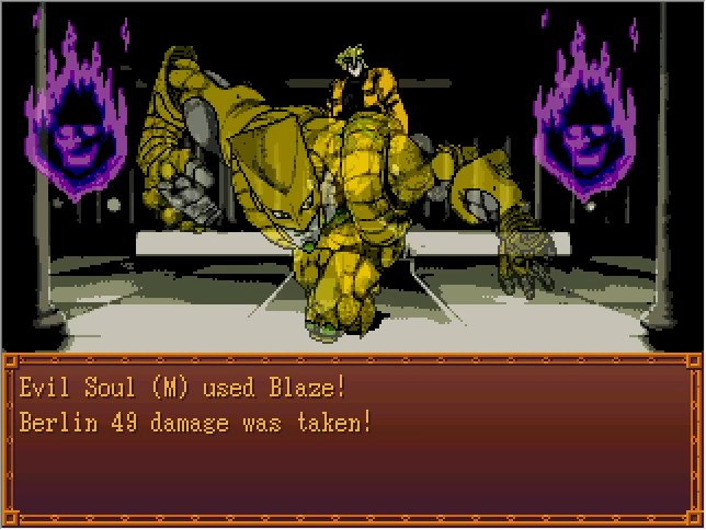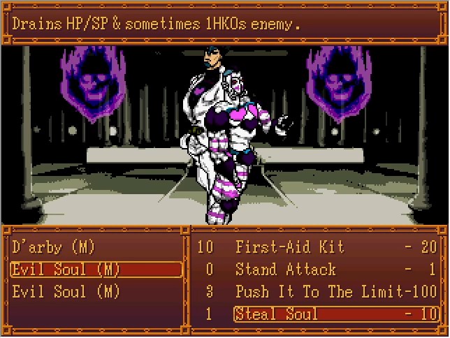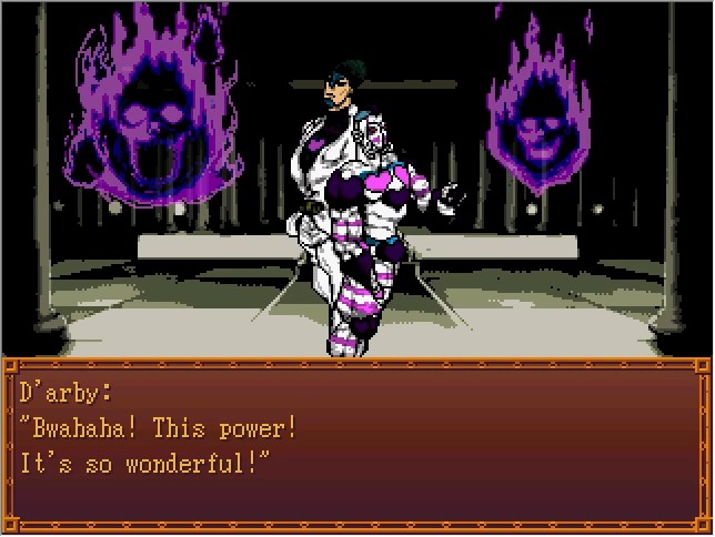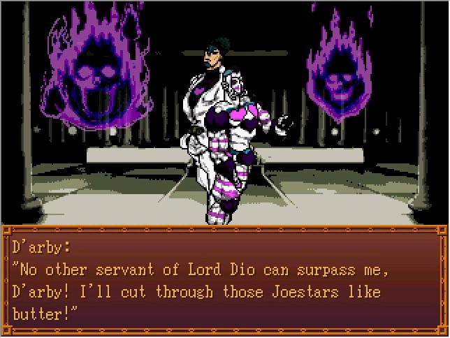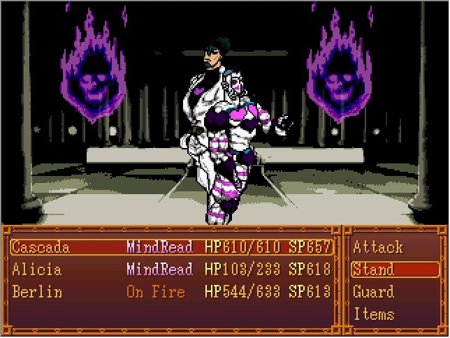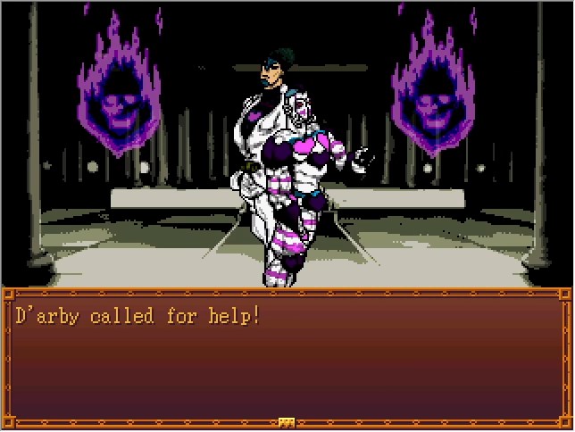 D'arby: Hm hm hm... Isn't this convenient... You'll make fine guinea pigs to test out my new power! Alicia: (There they are...! Please, defeat those soul-like Stands besides him as much as you can! The more you defeat, the more soul energy I receive! However, if I'm defeated, some of that energy will be expended to heal me...!) Berlin: (I'll try to protect her as much as I'm able, so please destroy them!)
