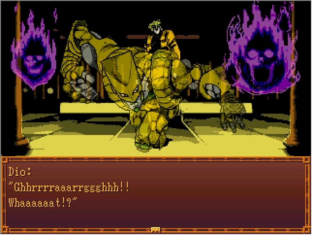 Dio: Worthless humans! I control you now! Prostrate yourself before my power and knowledge! Cascada: Rgh...! Dio: Well, playtime's finally over. I think I'll hang your bodies up as ornaments by the entrance. What will Mr. Joestar and the rest make of that, I wonder? Mwahaha! I can't wait to see... Die!! ...!?