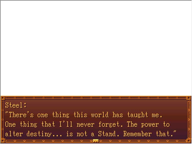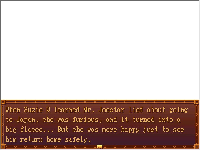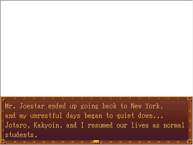 As for me... I work as an ally of justice, snuffing out problem Stand users located by the Speedwagon Foundation. Jotaro's currently traveling across the world making a name for himself in the field of marine biology. Mr. Joestar's been slowing down due to his age and has entered a long-overdue retirement. I hear that he's come to Japan to take care of something... It'll be nice to see him again after so long. Kakyoin, much to my surprise, became an elementary school teacher. His work brings him and Jotaro together quite often, so they've been chasing after a mysterious Stand-inducing bow and arrow... Polnareff, who's still in France, has been investigating a drug trafficking ring while looking for the same bow and arrow. Looks like he still loves to get in above his head... ...But as long as Abdul's there, he should be fine. They're probably squabbling with each other somewhere as we speak. Not much has changed after all these years... Speaking of, Iggy hasn't changed much either. At over 10 years, he's quite old for a dog, but he loves to make fools out of people all the same. He mostly hangs out with Polnareff these days.
