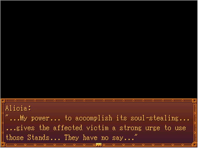 Alicia: Yes... This is the only way. I'll try to control my Stand... Element of Freedom... as much as I can... Cascada: So what's the plan? Alicia: To find those residing in Dio's mansion... And suck their life energy. Cascada: ...But how? Berlin: When the victim's possessed by her ability, it grants them their own will-o'-the-wisp like Stands. When they use them, their life energy is slowly sapped away... We may be able to use this to our advantage to change fate. Cascada: Okay... But how do you know that's going to work on them? Alicia: I wouldn't... worry about that...