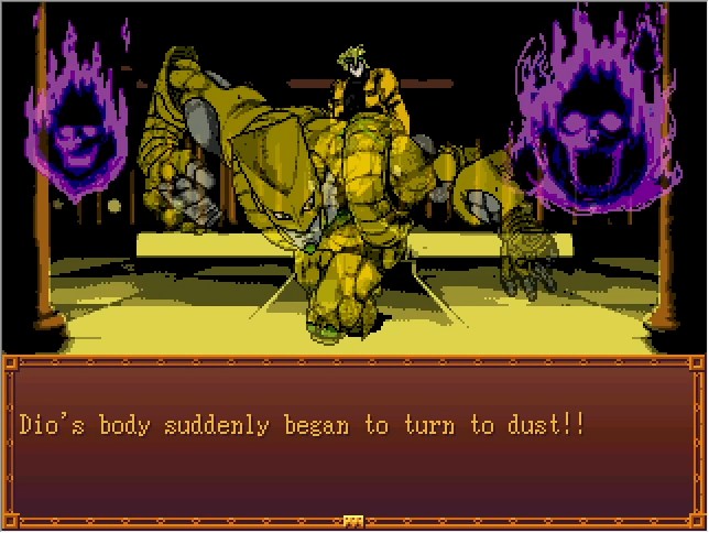 Cascada: ! No... it's nothing. Joseph:I'm curious, though... what was Dio's Stand like? You must have figured it out! Abdul:Yes, what was The World's ability? Cascada:Oh, uh... it was weirdly just like Star Platinum. That's how I figured out how to handle it in a fight. Jotaro:Hmm... Cascada:It did have another special ability, though... it could stop time for a few seconds. Kakyoin:!! What a terrifying power... Cascada:I handled it somehow. If he could have stretched out its fingers, then we might have had a problem... Jotaro:(Stop time... I wonder if I could...) Polnareff: All right! I guess it's happily-ever-after for us now! Kakyoin: Are you always so excitable? Oh, wait...